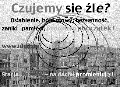 Pl - De - En | polskie teksty | dalsze miasta | Kontakty | Brodnica | Rybnik | Rzeszów | Słupsk | Warszawa | Ustawy i Druki | Inicjatywa Demokracji Bezpośredniej | choroba mikrofalowa | ukradli Polskę | Krytyka polskiej normy | Strona Pomiarowa | Wybór protestów w Polsce | księga gości: "Przeciwko masztom telefonii komórkowej" |