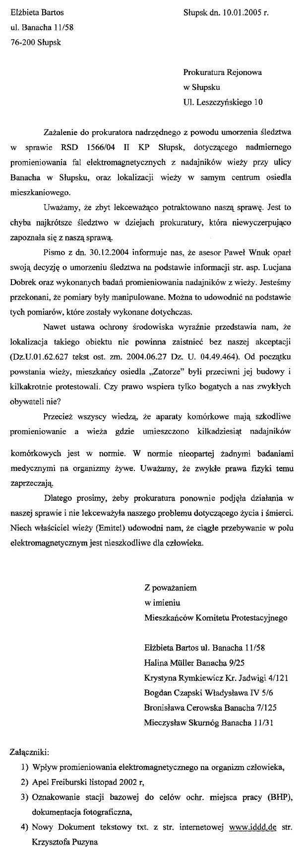 Neu hinzu | suchen | Statistik | Umrechner | Grenzwerte | Beweise Liste von 60 Toten und 53 Erkrankten beim Mobilfunkturm in Stolp-Original (scan, 300 KB) Die Namensliste der Betroffenen, aus dem Umkreis vom Mobilfunk-und Fernsehturm in Stolp/Słupsk, Polen, die an Krebs oder Herzkreislaufkrankheiten erkrankt oder gestorben sind. Słupsk-Fotki (Fotos aus der Umgebung) | List od Rzecznika Praw Obywatelskich | Cytaty dotyczące pomiarów w Polsce Dla waszych wpisów i kontaktów księga i notes: "Przeciwko masztom telefonii komórkowej" Podpisy: tutaj można bezpośrednio wpisać swoje poparcie i podpisać list do papieża. Prosimy o adresy kościołów z antenami, można je tu anonimowo wpisywać Zdjęcia w formacie jpg wzmacniają dodatkowo wypowiedź adresów.. Można je przesyłać na webmaster@umtsno.de Gästebuch-de Warszawa | Słupsk | Rybnik | Jasienica | Ostrołęka | Polanica | Świdnica | Brodnica | Ruski Bród |