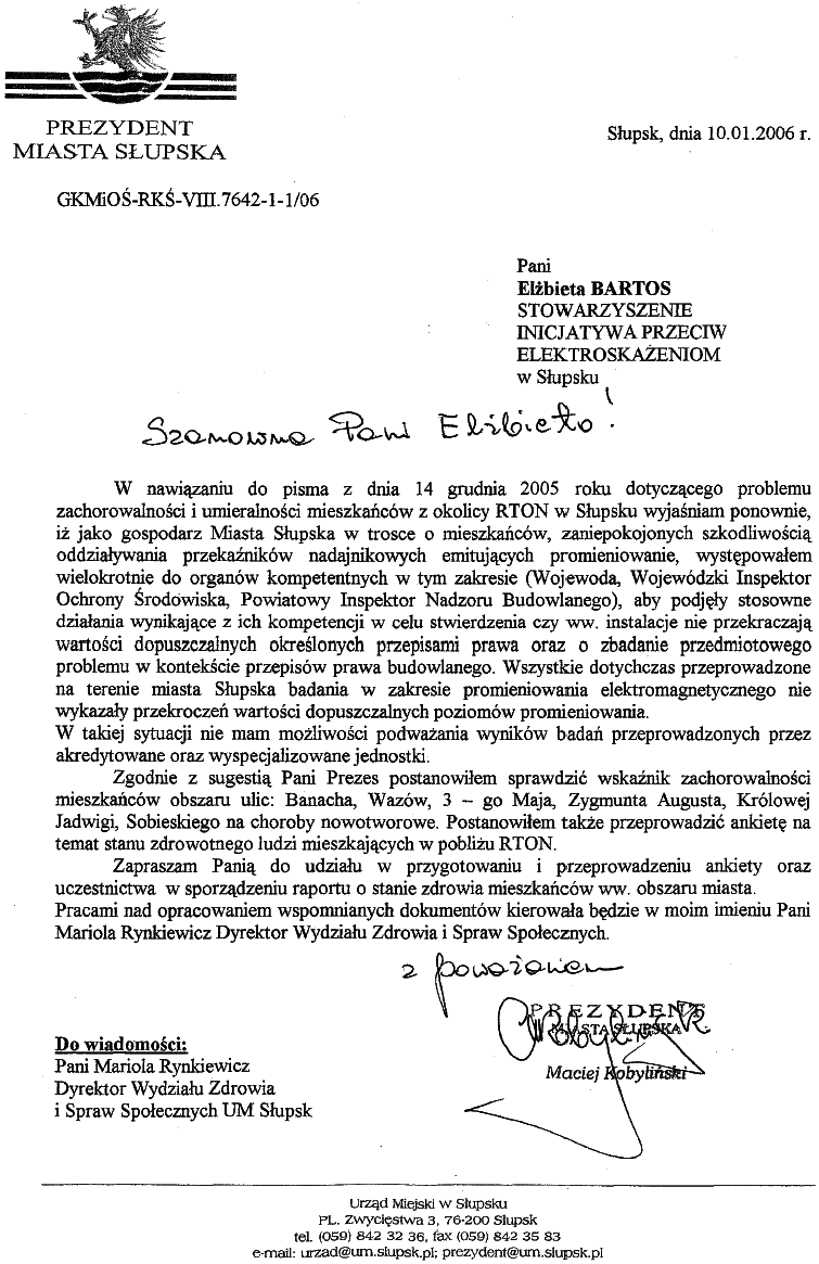 ![]() 4 marzec 2006 Słupsk. Biuletyn Informacji Publicznej: Zarządzenia Prezydenta Miasta z lutego 2006 Zarządzenia Prezydenta Miasta ze stycznia 2006 tam nie ma potwierdzenia decyzji z listu Prezydenta Miasta do pani Eli Bartos, tylko są decyzje o nieruchomościach. Zarządzenia pana Prezydenta Miasta Kobylińskiego czyta się jak wykaz biura maklerskiego. Widać, że ten Prezydent jest zajęty - handlem nieruchomościami.. Jeśli list do pani Elżbiety Bartos jest poważną ofertą to powinien zawierać decyzję o natychmiastowym odłączeniu wieży śmierci i wstrzymaniu budowy nowych BTS-ów takich jak budowy nowej stacji telefonii komórkowej sieci ERA GSM ale pan Prezydent Miasta Słupska informuje, że w publicznie dostępnym wykazie danych o decyzjach wymagających udziału społeczeństwa, pod numerem 6/05 umieszczona została decyzja Nr 5/06 z dnia 27 lutego 2006 roku o środowiskowych uwarunkowaniach zgody na realizację przedsięwzięcia polegającego na budowie stacji bazowej telefonii komórkowej sieci ERA GSM, zlokalizowanego na działce o numerze ewidencyjnym nr 302/9 przy ul. Obrońców Wybrzeża 4 w Słupsku realizowanego przez Polska Telefonię Cyfrową Sp. z o.o. z siedzibą w Warszawie, Al. Jerozolimskie 181. wprow. Joanna Miller (2006-03-03 14:33:10) Rak i inne choroby od stacji telefonii komórkowej są zbadanymi faktami nie od dzisiaj i tutaj odpowiedzialni za te inwestycje ludzie jak np Prezydent Miasta Kobyliński popełniają przestępstwo przeciwko ludzkości pozwalając na ciche mordy przez promieniowanie elektromagnetyczne z wieży śmierci gdy mydlą oczy pani Eli. ON JEST ZDECYDOWANIE ZA DŁUGO (od 1986 do 1990 i od 2002 do 2006 ) PREZYDENTEM MIASTA. Rotacja z inicjatywy Premiera Marcinkiewicza DOBRZE ZROBI MIASTU I SZPITALOWI. A może Prezydent Kobyliński sam zrezygnuje.. Co do wskaźników zachorowalności polecam moje wyliczenia z 2004 r. oraz prace z Naila i Netania Krzysztof Puzyna |