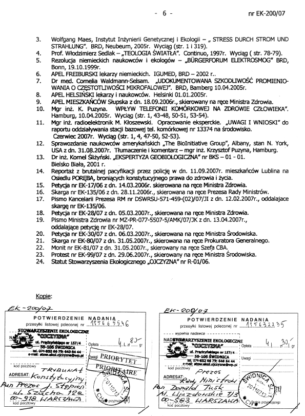 Szanowny Pan Prezes Rady Ministrów Donald Tusk Al. Ujazdowskie nr 1/3 00-583 WARSZAWA Strona Skarżąca: Stowarzyszenie Ekologiczne "OJCZYZNA" ul. Prądzyńskiego nr 157/4, 58-105 ŚWIDNICA Strony Przeciwne: a) Minister Środowiska ul. Wawelska nr 52/54 00-922 WARSZAWA b) Minister Zdrowia ul. Miodowa nr 15 00-952 WARSZAWA c) Minister Budownictwa ul. Wspólna nr 2/4 00-926 WARSZAWA Nasz nr EK-200/07 Świdnica, data: 20.11.2007 r. SKARGA na dokonane przez 3 Strony Przeciwne manipulacje w prawie ochrony środowiska, zdrowia i prawie budowlanym, godzące w środowisko, zdrowie Narodu i Konstytucję RP. Załączniki: 1. Wykaz ważniejszych manipulacji w prawie ochrony środowiska, zdrowia i prawie budowlanym, dokonanych w l. 2001-2007 przez Ministra Zdrowia, Środowiska i Ministra Budownictwa, godzących w Konstytucję, środowisko i zdrowie polskiego Narodu. 2. Zobrazowanie zapromieniowania terenu mikrofalowymi Polami Elektro-Magnetycznymi (PEM) przez stację bazową telefonii cyfrowej (komórkowej). więcej: plik, skarga do premiera Tuska, .doc, 215,3 KB plik PDF oryginalny w całości, .pdf, 2272,6 KB plik, ważniejszych manipulacji w prawie ochrony środowiska, zdrowia i prawie budowlanym, dokonanych w l. 2001-2007 przez Ministra Środowiska, Zdrowia i Ministra Budownictwa, godzących w Konstytucję, środowisko i zdrowie polskiego Narodu., .doc, 276,8 KB | |||