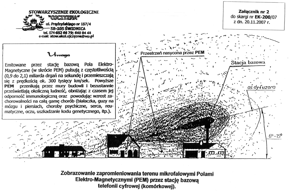Nasz nr EK-200/07 Świdnica, data: 20.11.2007 r. SKARGA na dokonane przez 3 Strony Przeciwne manipulacje w prawie ochrony środowiska, zdrowia i prawie budowlanym, godzące w środowisko, zdrowie Narodu i Konstytucję RP. Załącznik: 2. Zobrazowanie zapromieniowania terenu mikrofalowymi Polami Elektro-Magnetycznymi (PEM) przez stację bazową telefonii cyfrowej (komórkowej). więcej: Skarga na dokonane przez 3 Strony Przeciwne manipulacje plik, skarga do premiera Tuska, .doc, 215,3 KB plik PDF oryginalny w całości, .pdf, 2272,6 KB plik, ważniejszych manipulacji w prawie ochrony środowiska, zdrowia i prawie budowlanym, dokonanych w l. 2001-2007 przez Ministra Środowiska, Zdrowia i Ministra Budownictwa, godzących w Konstytucję, środowisko i zdrowie polskiego Narodu., .doc, 276,8 KB | |||