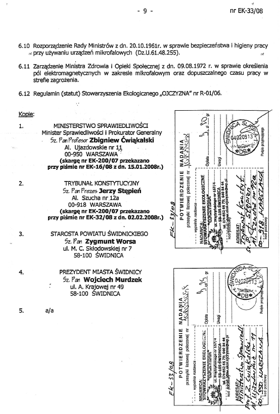 Nasz nr EK-33/08 Świdnica, 04.02.2008r. Samorządowe Kolegium Odwoławcze w Wałbrzychu ul. Dmowskiego nr 22 58-300 WAŁBRZYCH Za pośrednictwem: Prezydenta Miasta Świdnicy ul. Armii Krajowej nr 49 58-105 ŚWIDNICA Strona skarżąca: Stowarzyszenie Ekologiczne "OJCZYZNA" ul. Prądzyńskiego 157/4 58-105 ŚWIDNICA Strona w postępowaniu wg [2.5]. Strona przeciwna: Prezydent Miasta Świdnicy ul. Armii Krajowej nr 49 58-105 ŚWIDNICA ODWOŁANIE o uchylenie DECYZJI Prezydenta Świdnicy Nr 7/Ś/08, znak DIM. Oś. 7625-13/07-08 z dn. 18.01.2008r., umarzającej postępowanie w sprawie wydania decyzji o środowiskowych uwarunkowaniach zgody na realizacje przedsięwzięcia p. n. "PRZEBUDOWA STACJI BAZOWEJ TELEFONII KOMÓRKOWEJ PTK CENTERTEL NR TO-3321/4359 przy ul. Nauczycielskiej nr 3 w Świdnicy". Strona Skarżąca kierując się interesem społecznym (obrona zdrowia i życia ludności, w tym szczególnie dzieci, środowiska, Konstytucji, zachowania wartości mieszkań Mieszkańców Świdnicy) oraz postanowieniami poniższego prawa: a) Art. 2; 8.2; 39; 66.1; 68.1; 68.3; 68.4; 74.1; 74.2; 74.3; i 74.4 Konstytucji 2.11], b) Art. 28; 29 i art. 154 § 1 Kodeksu postępowania administracyjnego [2.13], - 2 - nr EK-33/08 c) Art. 66.1, pkt 2) Prawa budowlanego - Dz.U.06.156.1188 [2.19], d) Art. 36.1, pkt 1) Ustawy o planowaniu i zagospodarowaniu przestrzennym - Dz.U.03.80.717 [2.14], e) Art. 323.2 Prawa ochrony środowiska - Dz.U.06.129.902 [2.18], f) § 4, pkt 1) Regulaminu (statutu) nr R-01/06 Stowarzyszenia Ekologicznego "OJCZYZNA" [2.21], wnosi odwołanie o wstrzymanie wykonania i uchylenie w całości DECYZJI Nr 7/Ś/08, wydanej przez Prezydenta Świdnicy [2.7], wyjaśniając i zarzucając jak niżej. 1. Wstęp 1.1 Decyzja nr 7/Ś/08 z dn. 18.01.2008r. [2.7] została doręczona Stronie Skarżącej w dn. 25.01.2008r. W związku z tym 14 - dniowy termin złożenia niniejszego odwołania upływa w dn. 08.02.2008 r. 1.2 Wodociągowa wieża ciśnień zlokalizowana na świdnickiej starówce przy ul. Nau-czycielskiej nr 3 znajduje się pośrodku licznych placówek szkolno-wychowaczych i penitencjarnych oraz starego budownictwa mieszkalnego, koncentrujących duże ilości dzieci i innych osób o podwyższonym ryzyku zdrowotnym (pr. prównać art. 68.3 Konstytucji RP [2.12]). W szczególności dotyczy to Szkoły Podstawowej nr 315; Przedszkola nr 4, Młodzieżowego Domu Kultury; Zakładu Poprawczego Dla Nieletnich, Seminarium Duchownego; Pogotowia Ratunkowego; Szkoły Muzycznej i Aresztu Śledczego. Rozmieszczenie w/w placówek w pobliżu wieży ciśnień, zilustrowane jest szczegółowo na załączniku nr 7.1 do Opinii [2.4]. 1.3 Aktualnie na wieży ciśnień jak w p. 1.2 eksploatowana jest stacja bazowa tel. cyfrowej nr 49554, której moc emisji zgodnie z Decyzją [2.1] wynosi N EIRP = 10437 [W]. Stacja ta truje skoncentrowane obok skupiska dzieci i młodzieży oraz osób o podwyższonym ryzyku zdrowotnym (art. 68.3 Konstytucji) już drugi rok, mimo złożenia skargi kasacyjnej [2.2] na uchylenie Decyzji uzgodnień środowiskowych nr 27/Ś/06 [2.1]. 1.4 Mając na uwadze wzrost zysków operatora i właściciela wieży ciśnień, obok eksploatowanej obecnie stacji nr 49554 ma być zabudowana druga stacja ORANGE nr 3321/4359 - "ŚWIDNICA CENTRUM", której pierwotnie planowana moc emisji miała wynosić N EIRP = 18456 [W]. Wg ostatnio dokonanej korekty na azymucie 300 wg [2.6], ostatecznie moc tej nowej stacji (wliczając radiolinię RLA 38-03, 38 GHz) ma wynieść N EIRP = 16531 [br> W przypadku zrealizowania planowanej inwestycji, obie stacje będą rozpylać nad głowami dzieci, młodzieży i schorowanych emerytów mikrofalowe pola (PEM) o łącznej mocy emisji S N EIRP = 10437 + 16531 = 26 968 [W]. Proceder powyższy będzie generował białaczkę u dzieci, nowotwory mózgu, nerwu słuchowego, masowe występowanie guzów w piersiach kobiet i całą gamę naj-cięższych chorób wyszczególnionych i udokumentowanych naukowo w p. 2 skargi nr EK-200/07 [2.8], skierowanej na ręce Prezesa Rady Ministrów oraz Trybunału Konstytucyjnego. - 3 - nr EK-33/08 Przeciwstawiając się powyższym zbrodniczym zamiarom, podbudowanym przestępczym Rozporządzeniem [2.20] wyemitowanym na zlecenie koncernów telefonii cyfrowej, Strona Skarżąca wystosowała protest nr EK-30/08 [2.9], skie-rowany do Ministra Edukacji i najwyższych Organów Sądowych. 2. Powołane w odwołaniu dokumenty i oznaczenia (symbole). 2.1 Nr 27/Ś/06 - Decyzja Prezydenta Świdnicy z dn.. 18.05.2006r. o środowiskowych uwarunkowaniach zgody na realizacje przedsięwzięcia p.n. "ROZBUDOWA STACJI BAZOWEJ TELEFONII CYFROWEJ SIECI ERA NR 49554" przy ul. Nauczycielskiej nr 3 w Świdnicy. 2.2. Sygn. akt II SA/Wr 639/06 - Skarga kasacyjna z dn. 25.10.2007r. do NSA - Warszawa/WSA-Wrocław w sprawie uchylenia Decyzji środowiskowej Prezydenta Świdnicy nr 27/Ś/06. 2.3 Obwieszczenie Prezydenta Świdnicy z dn. 31.07.2007r w sprawie wszczętego postępowania dla wydania decyzji o środowiskowych uwarunkowaniach zgody na realizację przedsięwzięcia p. n. "PRZEBUDOWA STACJI BAZOWEJ TELEFONII KOMÓRKOWEJ PTK CENTERTEL NR 3321/4359", przy ul. Nauczycielskiej nr 3 w Świdnicy. 2.4 Nr EK-135/07 z dn. 22.08.2007r. Opinia Stowarzyszenia Ekologicznego "OJCZYZNA" w sprawie planowanej rozbudowy mocy emisji stacji bazowych tel. cyfrowej na wodociągowej wieży ciśnień przy ul. Nauczycielskiej nr 3 w Świdnicy. 2.5 Nr DIM. Oś. 7625 - 13/07. Postanowienie Prezydenta Świdnicy o dopuszczeniu Sto-warzyszenia Ekologicznego "OJCZYZNA" do uczestnictwa na prawach strony w po-stępowaniu dla wydania decyzji o środowiskowych uwarunkowaniach zgody na realizację przedsięwzięcia p. n. "PRZEBUDOWA STACJI BAZOWEJ TELEFONII KOMÓRKOWEJ PTK CENTERTEL NR 3321/4359", przy ul. Nauczycielskiej nr 3 w Świdnicy. 2.6 Kwalifikacja przedsięwzięcia pod względem konieczności sporządzania raportu o oddziaływaniu przedsięwzięcia na środowisko. PRZEBUDOWA (MODERNIZACJA) ISTNIEJĄ
