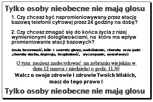 ![]() 7 Mar 2006 W niedzielę(26.03) kolejny termin zebrania i kolejna bitwa na argumenty i opanowanie. Chcemy wnioskować za tajnym głosowaniem, gdyż pod okiem księdza , wójta, sołtysa ,komitetu parafialnego dla wielu mieszkańców jest to trudne. Karta do głosowania nasza propozycja: Proszę odpowiedzieć na jedno z pytań, stawiając krzyżyk w odpowiedniej kratce: 1. Czy jest Pani/Pan przeciwny budowie stacji bazowej telefonii cyfrowej na wieży kościoła? 2. Czy jest Pani/Pan za budową stacji bazowej telefonii cyfrowej na wieży kościoła? Poza tym rozwieszamy z p. Józkiem Galbarczykiem (jedyna strona, gdyż teren oddziaływania wynosi w raporcie 36 m) takie plakaty, zał.) oraz przeprowadzamy rozmowy informujące o ważności zebrania dla sprawy z osobami które poparły nasz protest (170 na 350 uprawnionych do głosowania). Pozdrawiam. E.Zygłowicz 5 Mar 2006 Witam, Dziękuję za ustosunkowanie się, i za cenne informacje. Jesteśmy po drugiej rozprawie administracyjnej, na której udało się podważyć prawomocność uchwały zebrania wiejskiego w sprawie budowy stacji ("za " głosowało 28 osób na 56). Zebranie odbyło się w I-szym terminie, a nie powinno, bo nie było 1/5 mieszkańców uprawnionych do głosowania. Pan Zbigniew był na rozprawie, wspomagał nas swoim doświadczeniem i znajomością rzeczy. Pozdrawiam Panie Krzysztofie, życząc dobrych dni, jak najwięcej. E.Zyglowicz |