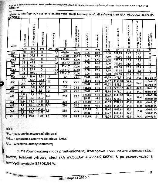 ![]() 2.3.2007r. Suma równoważnej mocy promieniowanej izotropowo przez system antenowy stacji bazowej telefonii cyfrowej sieci ERA WROCŁAW 46277.05 Krzyki U po przeprowadzonej inwestycji wyniesie 32508.34 Watów. Tabela 3 od lewej: Antena, Częstotliwość, zysk kierunkowy anteny, straty połączeń, wymiar anteny, azymut, wysokość zawieszenia (poziom osi anten), moc nadajnika, moc doprowadzenia do anteny, moc izotropowa EIRP, zasięg obszaru 0,1 wata/m2, zasięg obszaru 0,1 wata/m2 od anten w sektorze, pochylenie osi promieniowania. |