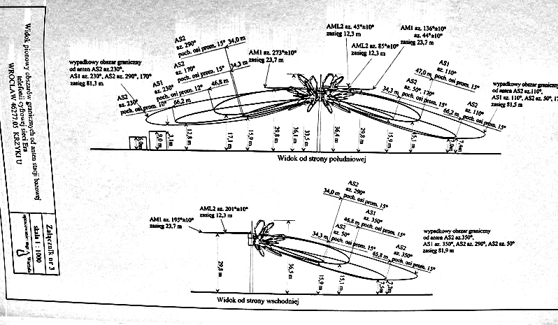 8.11.06, Raport oddziaływania na środowisko, Przekroje obszarów granicznych od anten stacji bazowej o wartości 0,1 W/m2 w płaszczyźnie pionowej, załącznik 3