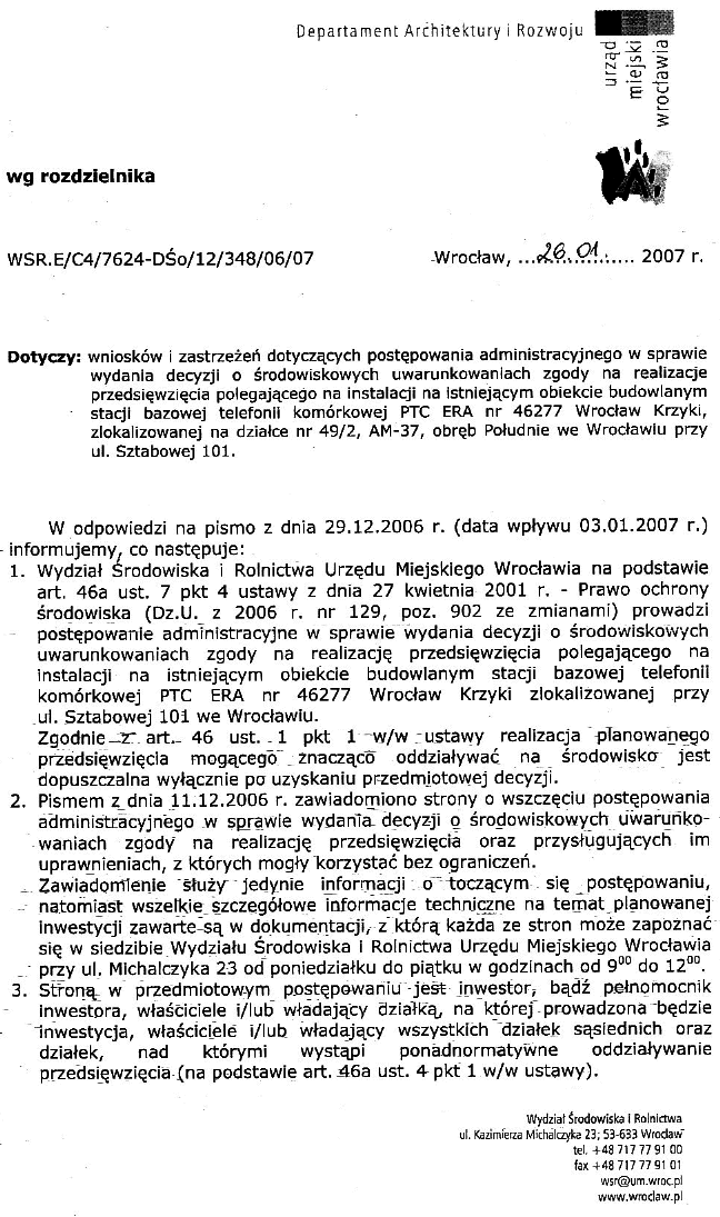 26.1.2007r. odpowiedź na pismo z 29 grudnia 2006r. w sprawie postępowania administracyjnego dot. decyzji o środowiskowych uwarunkowaniach, wykręty Bogdana Łukasiewicza