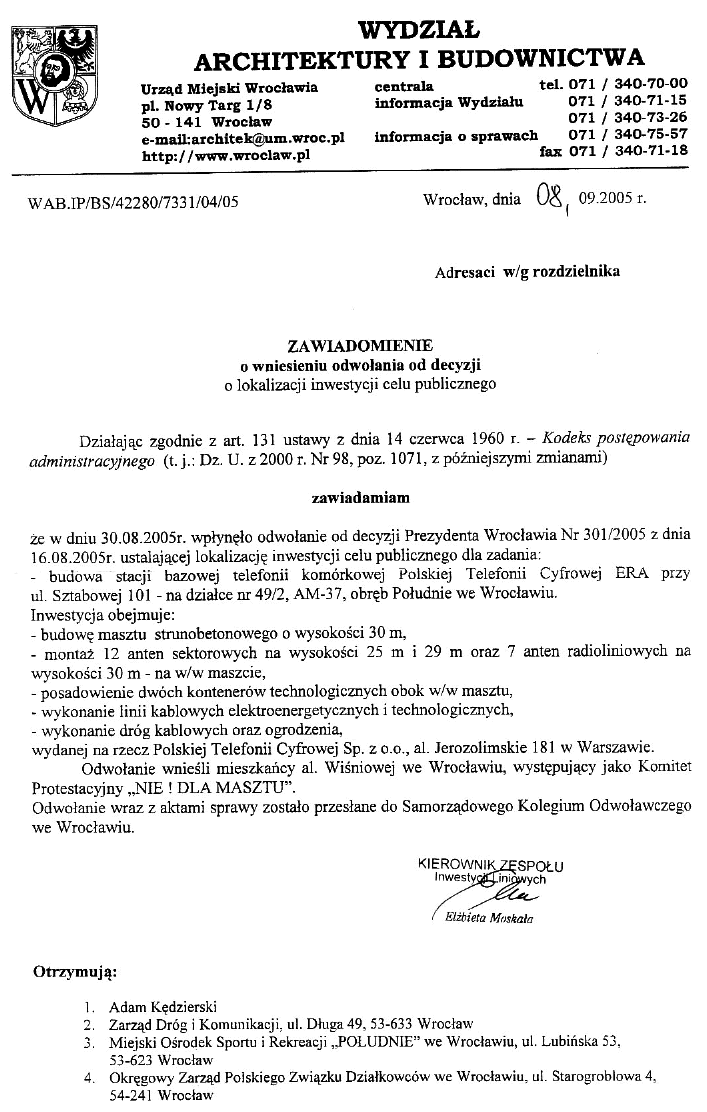 8.9.05, zawiadomienie o wniesieniu odwołania z 30.08.2005r. przez mieszkańców ulicy Wiśniowej od decyzji Prezydenta Miasta Wrocławia