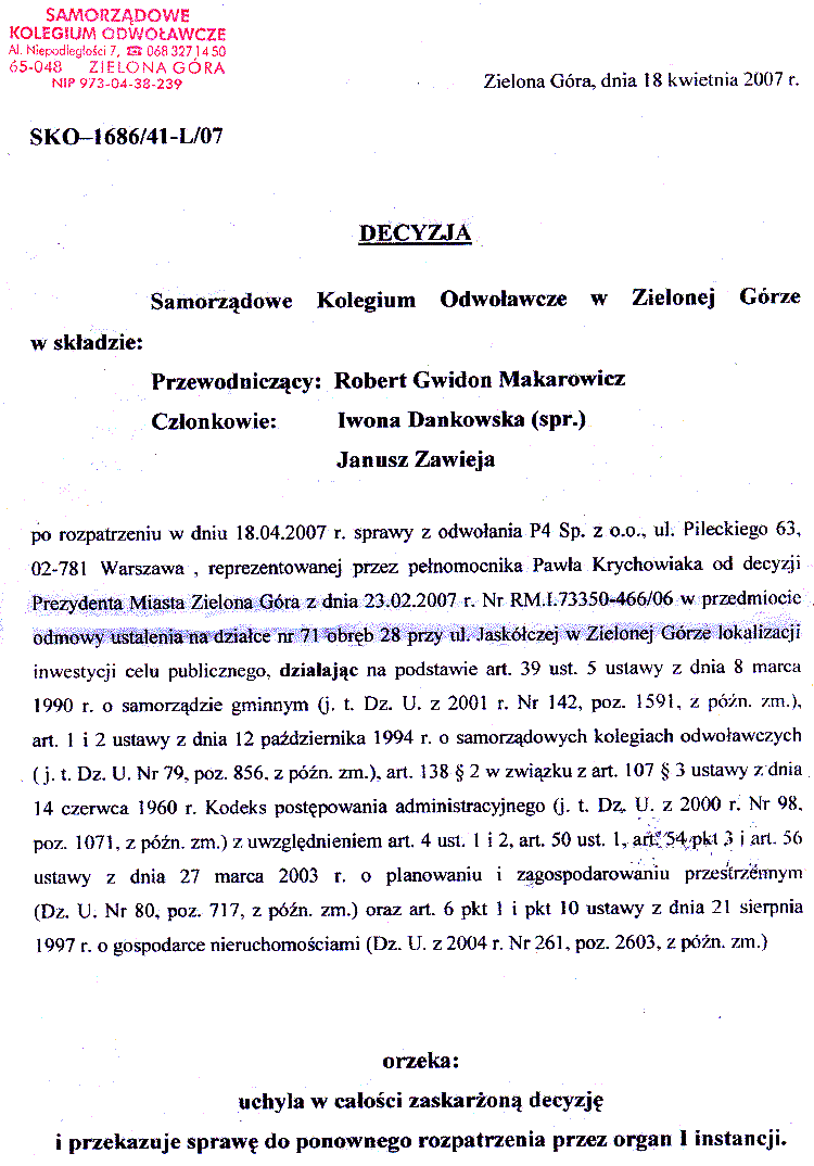 18 kwietnia 2007 r. Zielona Góra, Szkoła Podstawowa nr 14, Samorządowe Kolegium Odwoławcze w Zielonej Górze Robert Gwidon Makarowicz i Janusz Zawieja uchylają wbrew woli mieszkańców i Prezydenta Miasta w całości zaskarżoną przez P4 decyzję i przekazują sprawę do ponownego rozpatrzenia przez organ I instancji. Swoim działaniem na korzyść firmy P4 panowie Robert Gwidon Makarowicz i Janusz Zawieja oszukują dotkniętych inwazją P4 mieszkańców oraz Prezydenta Miasta Zielona Góra rzucając na siebie podejrzenie o korupcję. |