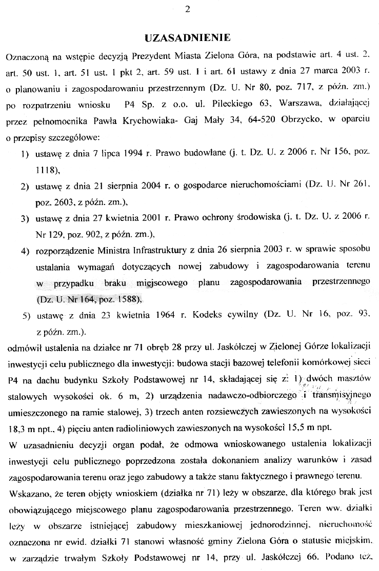 18 kwietnia 2007 r. Zielona Góra, Szkoła Podstawowa nr 14, Samorządowe Kolegium Odwoławcze w Zielonej Górze Robert Gwidon Makarowicz i Janusz Zawieja uchylają wbrew woli mieszkańców i Prezydenta Miasta w całości zaskarżoną przez P4 decyzję i przekazują sprawę do ponownego rozpatrzenia przez organ I instancji. Swoim działaniem na korzyść firmy P4 panowie Robert Gwidon Makarowicz i Janusz Zawieja oszukują dotkniętych inwazją P4 mieszkańców oraz Prezydenta Miasta Zielona Góra rzucając na siebie podejrzenie o korupcję. |