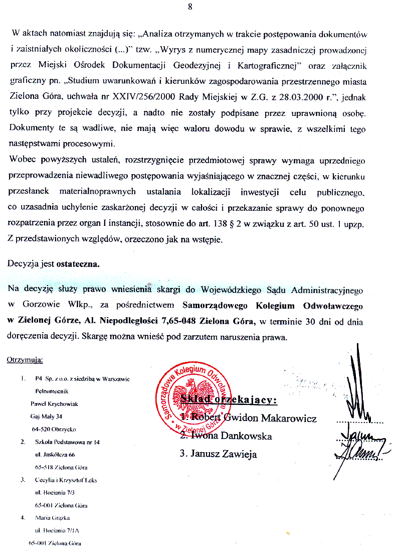 18 kwietnia 2007 r. Zielona Góra, Szkoła Podstawowa nr 14, Samorządowe Kolegium Odwoławcze w Zielonej Górze Robert Gwidon Makarowicz i Janusz Zawieja uchylają wbrew woli mieszkańców i Prezydenta Miasta w całości zaskarżoną przez P4 decyzję i przekazują sprawę do ponownego rozpatrzenia przez organ I instancji. Swoim działaniem na korzyść firmy P4 panowie Robert Gwidon Makarowicz i Janusz Zawieja oszukują dotkniętych inwazją P4 mieszkańców oraz Prezydenta Miasta Zielona Góra rzucając na siebie podejrzenie o korupcję. |