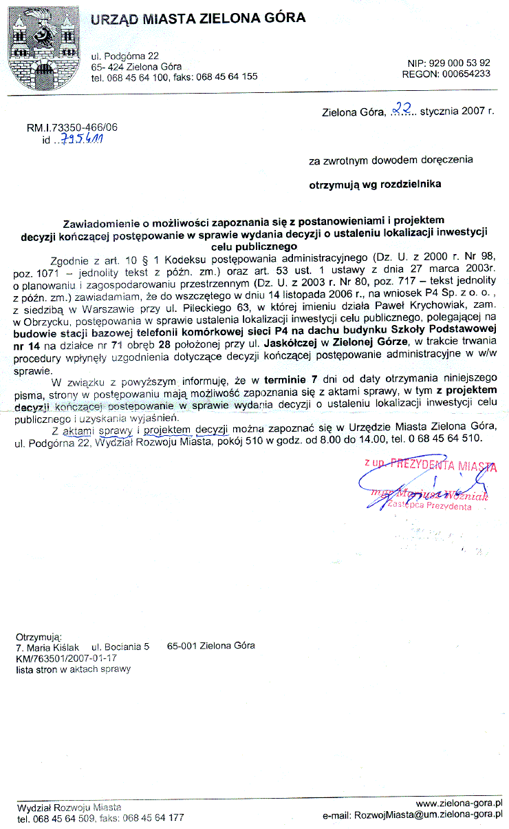 22 stycznia 2007 r. Zielona Góra, zawiadomienie o możliwości zapoznania się z postanowieniami i projektem decyzji kończącej postępowanie w sprawie wydania decyzji o ustaleniu lokalizacji inwestycji celu publicznego na wniosek P4 podpisał z upoważnienia Prezydenta Miasta, zastępca Mariusz Woźniak | |