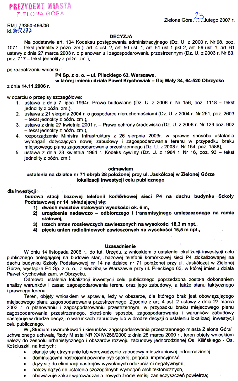 Decyzja po rozpatrzeniu wniosku P4 Sp. z o.o. - ul. Pileckiego 63, Warszawa, w której imieniu działa Paweł Krychowiak - Gaj Mały 34 64-520 Obrzycko z dnia 14.11.2006 r. odmawiam ustalenia na działce nr 71 obręb 28 położonej przy ul. Jaskółczej w Zielonej Górze lokalizacji inwestycji celu publicznego dla inwestycji budowa stacji bazowej telefonii komórkowej sieci P4 na dachu budynku Szkoły Podstawowej nr 14 składającej się: 1. dwóch masztów stalowych wysokości ok. 6 m 2. urządzenia nadawczo - odbiorczego i transmisyjnego umieszczonego na ramie stalowej. 3. trzech anten rozsiewczych zawieszonych na wysokości 18,3 m npt., 4. pięciu anten radioliniowych zawieszonych na wysokości 15,5 m npt. |