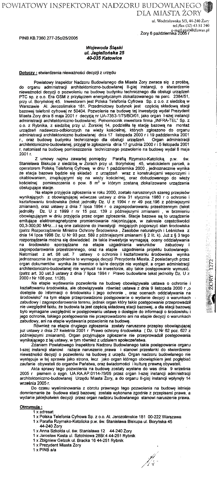 ![]() 07 Oct 2005 Pozdrawiam Zbigniew Gelzok. Powiatowy Inspektor Nadzoru Budowlanego dla Miasta Żory, do Wojewody Śląskiego (.pdf, 168,8 KB) |