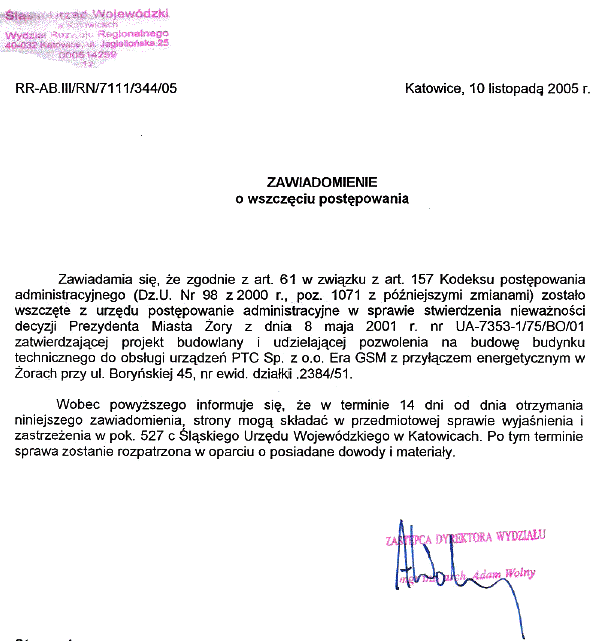 W Żorach teraz wojna | Decyzja Kolegium Samorządowego w Katowicach | Powiatowy Inspektor Nadzoru Budowlanego dla Miasta Żory, decyzja | To powinni zobaczyć Polacy | Decyzja Prezydenta miasta Żory z uwagi na wycofanie wniosku strony POLKOMTEL | Czy Prokuratura Apelacyjna przywróci stosowanie prawa ? Żory strona główna |
