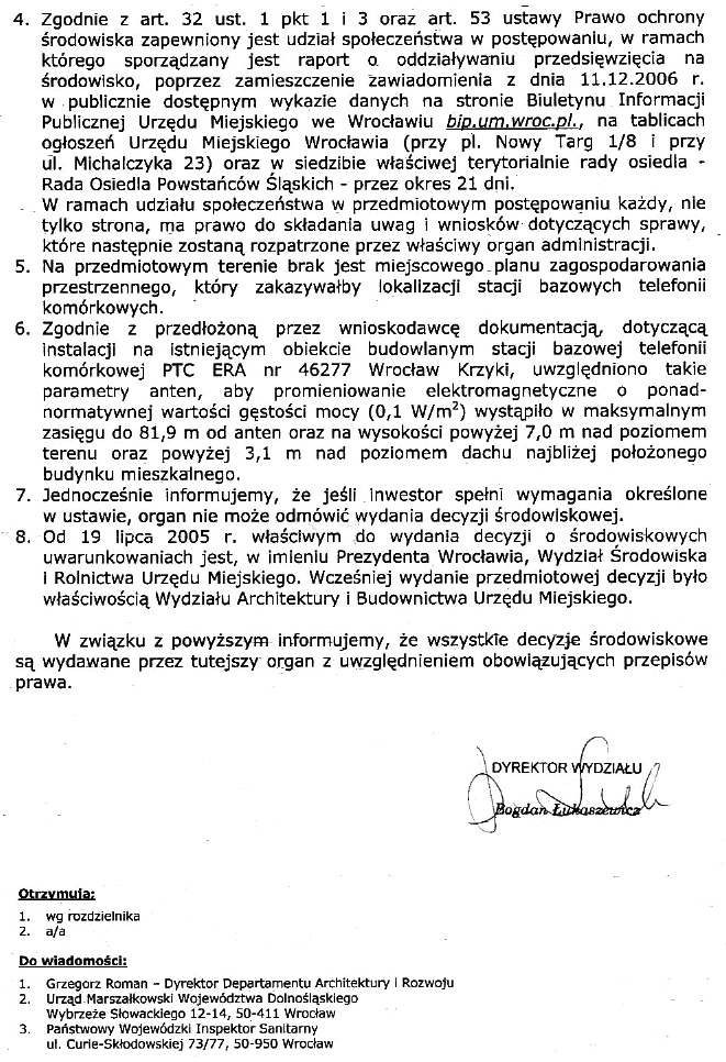 26.1.2007r. odpowiedź na pismo z 29 grudnia 2006r. w sprawie postępowania administracyjnego dot. decyzji o środowiskowych uwarunkowaniach, wykręty Bogdana Łukasiewicza