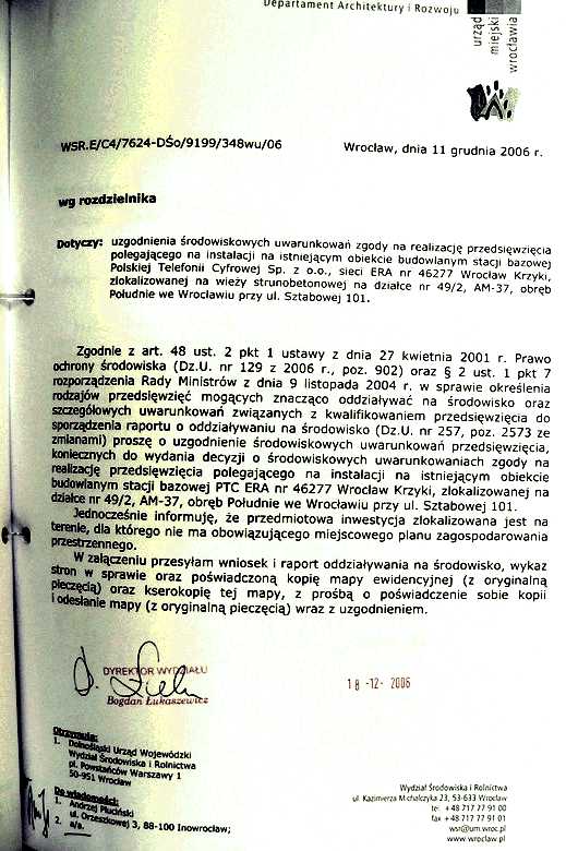 11 grudnia 2006r. w załączeniu przesyłam wniosek i raport oddziaływania na środowisko
