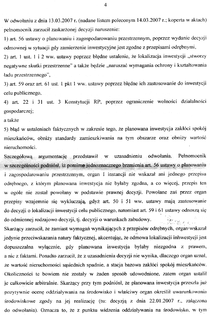 18 kwietnia 2007 r. Zielona Góra, Szkoła Podstawowa nr 14, Samorządowe Kolegium Odwoławcze w Zielonej Górze Robert Gwidon Makarowicz i Janusz Zawieja uchylają wbrew woli mieszkańców i Prezydenta Miasta w całości zaskarżoną przez P4 decyzję i przekazują sprawę do ponownego rozpatrzenia przez organ I instancji. Swoim działaniem na korzyść firmy P4 panowie Robert Gwidon Makarowicz i Janusz Zawieja oszukują dotkniętych inwazją P4 mieszkańców oraz Prezydenta Miasta Zielona Góra rzucając na siebie podejrzenie o korupcję. |